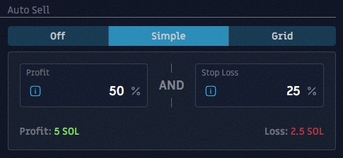 Establezca su objetivo de beneficios y su stop loss como porcentajes, y Sniperoo se encargará del resto. Por ejemplo, con un objetivo de beneficios del 50% y un stop loss del 25%, el sistema supervisa automáticamente su posición y ejecuta la condición que se active primero.