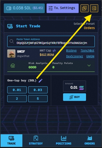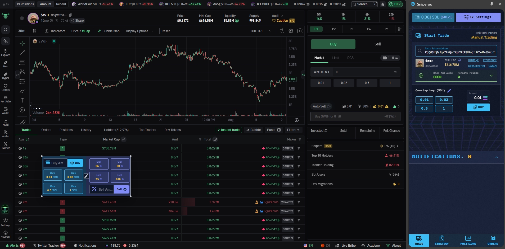 La barra lateral de Sniperoo es una herramienta muy potente para operar de forma rápida y eficaz, que le permite comprar, vender y analizar fichas, así como realizar un seguimiento de sus posiciones y del rendimiento de sus operaciones desde cualquier lugar de Internet en el que se encuentre.