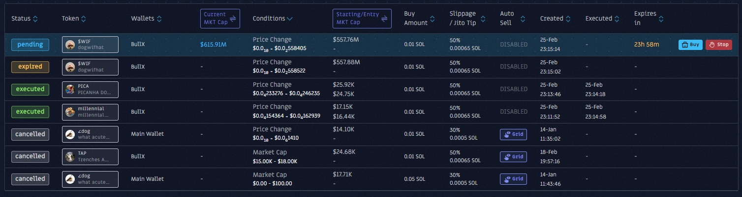 Sólo las órdenes pendientes están activas, por lo tanto puede interactuar con ellas directamente utilizando los botones Comprar o Detener en el extremo derecho de la fila.