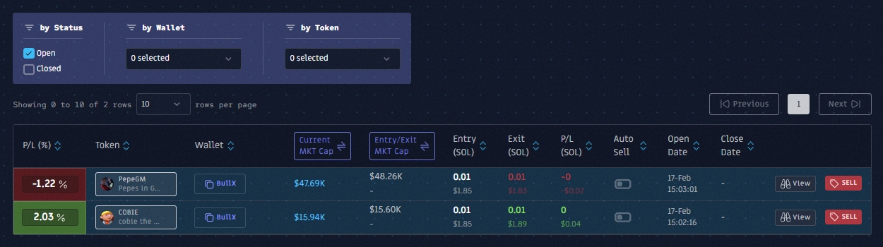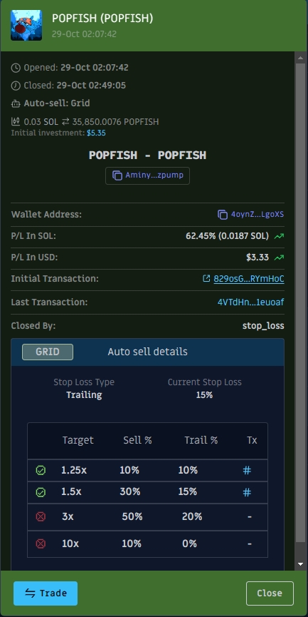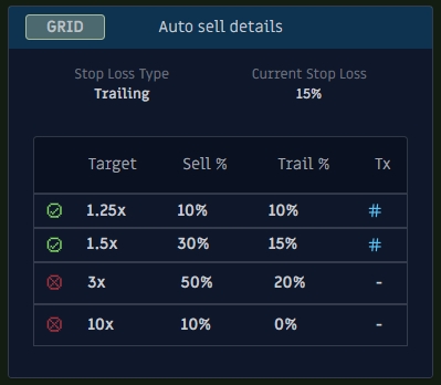 Una característica clave que notará es el indicador Grid en la columna «Auto Sell». Esto le indica que una estrategia automatizada está protegiendo su posición. Cuando vea este indicador, significa que su posición tiene puntos de salida predeterminados.