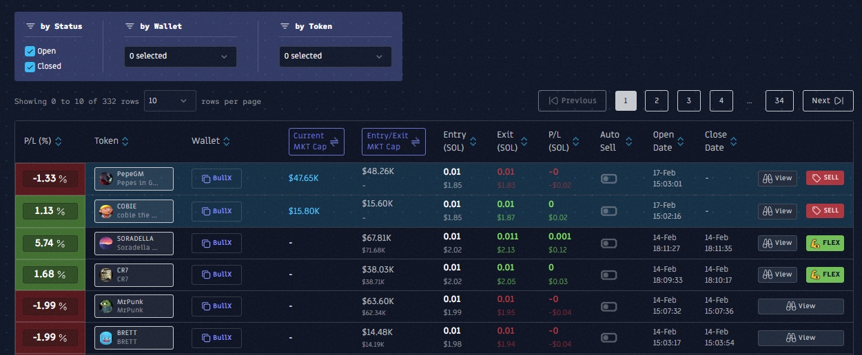 View / Flex / Sell - El botón View está disponible para todas las posiciones. El botón Vender está disponible para las posiciones abiertas. Flex está disponible para las posiciones cerradas rentables.