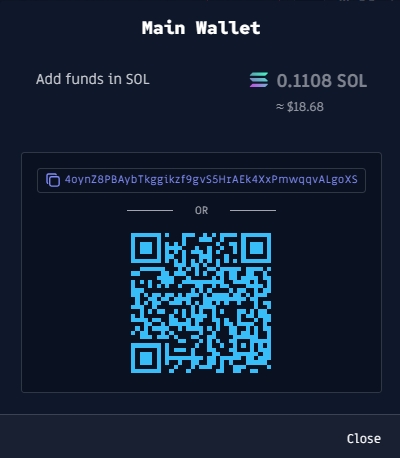 Para añadir fondos, puedes simplemente copiar el enlace o escanear el código QR y enviar SOL desde tu CEX (como Binance, CoinBase,KuCoin), Phantom o cualquier otro monedero que admita la red Solana.