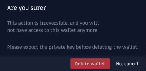 Le recomendamos que NO elimine sus cuentas de monedero. En caso de que hayas creado monederos por error, o quieras organizar tus monederos actuales, te recomendamos encarecidamente que transfieras fondos y exportes la clave privada del monedero antes de eliminarlo.